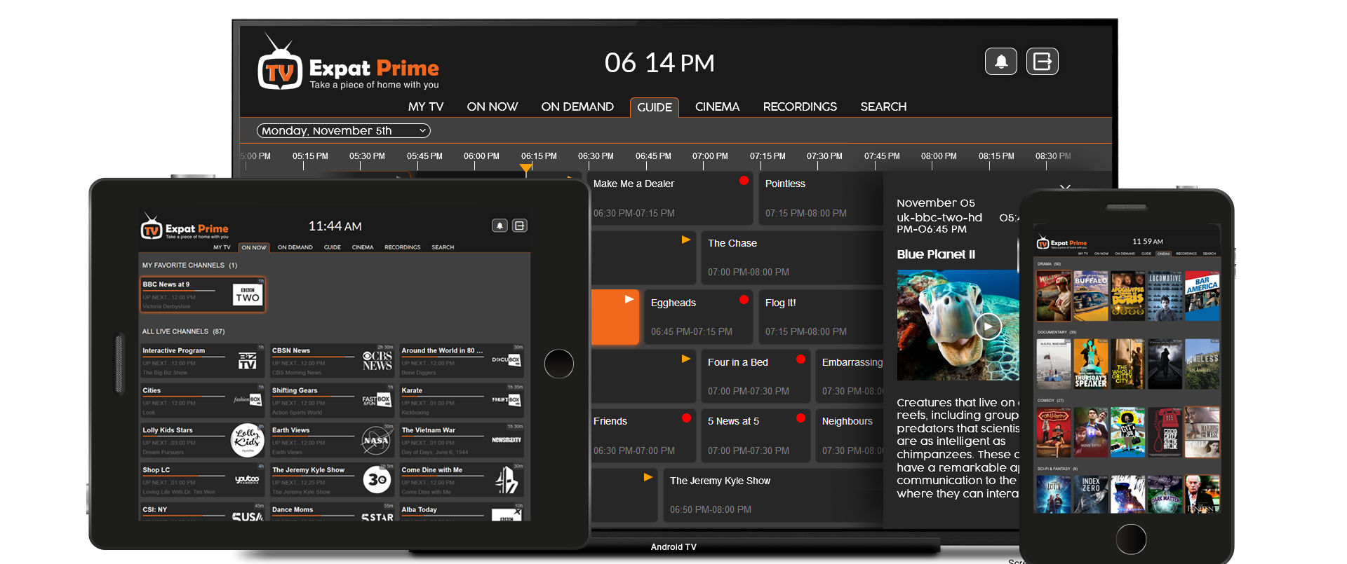 Side-by-side, in another room, or on the go. Set entertainment free with Expat Prime and enjoy live channels, Catch Up and On Demand on your mobile or tablet wherever there’s WiFi, 3G or 4G.